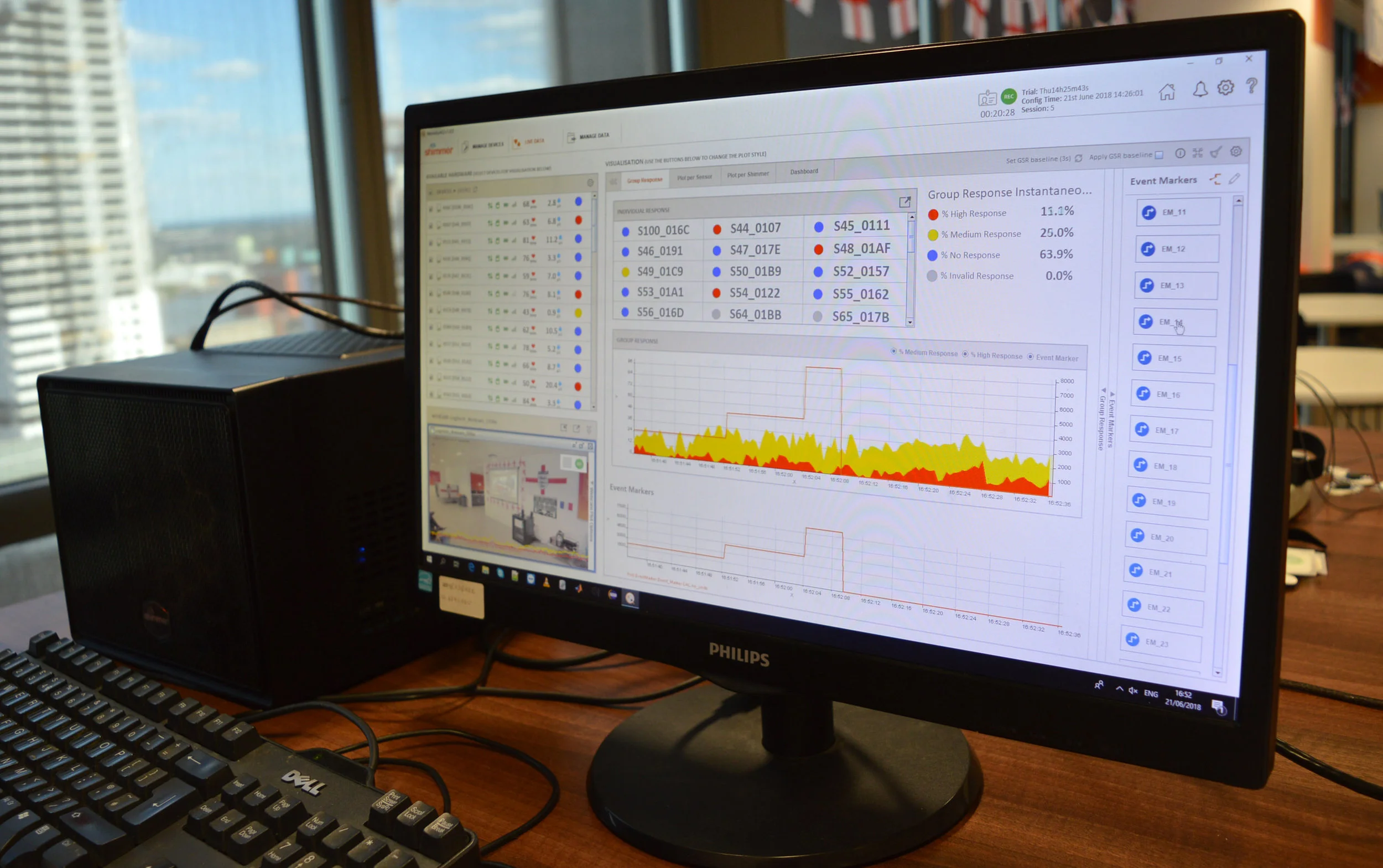 Insights into emotional responses are captured using the NeuroLynQ biometric sensor and a webcam that records the content shown. A display screen shows the individual and collective responses of the participants in real-time which helps to understand the engagement level of participants. It is also possible to aggregate sessions for segment analysis.